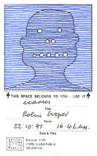 "At about 03 am this morning (21th December, 2001) Chris Nolan, the Robin´s wife, called me to announce the death of her man ROBIN CROZIER during the past night. May his memory/malaise and all other fluxus and networking remain in your history. Please send this news to your friends and network-correspondents. Greetings Jose Vandenbroucke"