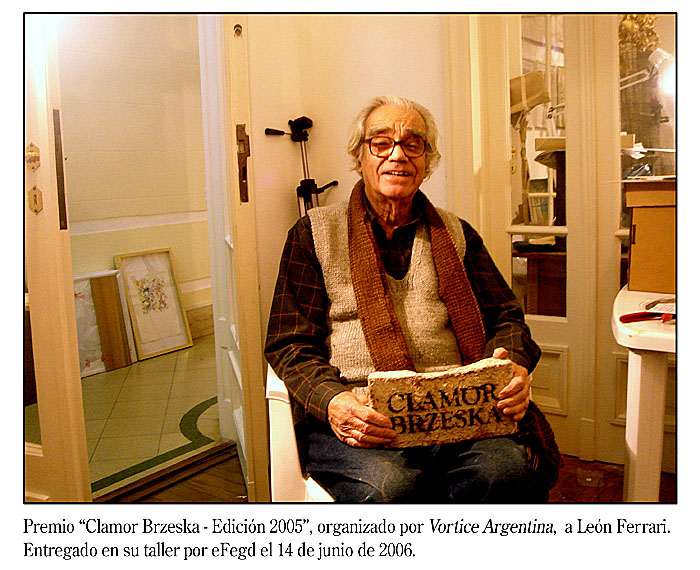 Fernando Fazzolari, Juan Carlos Romero, León Ferrari recibiendo su premio "Clamor Brazeska" y FGD en la Barraca Vorticista; 28 de Diciembre de 2004